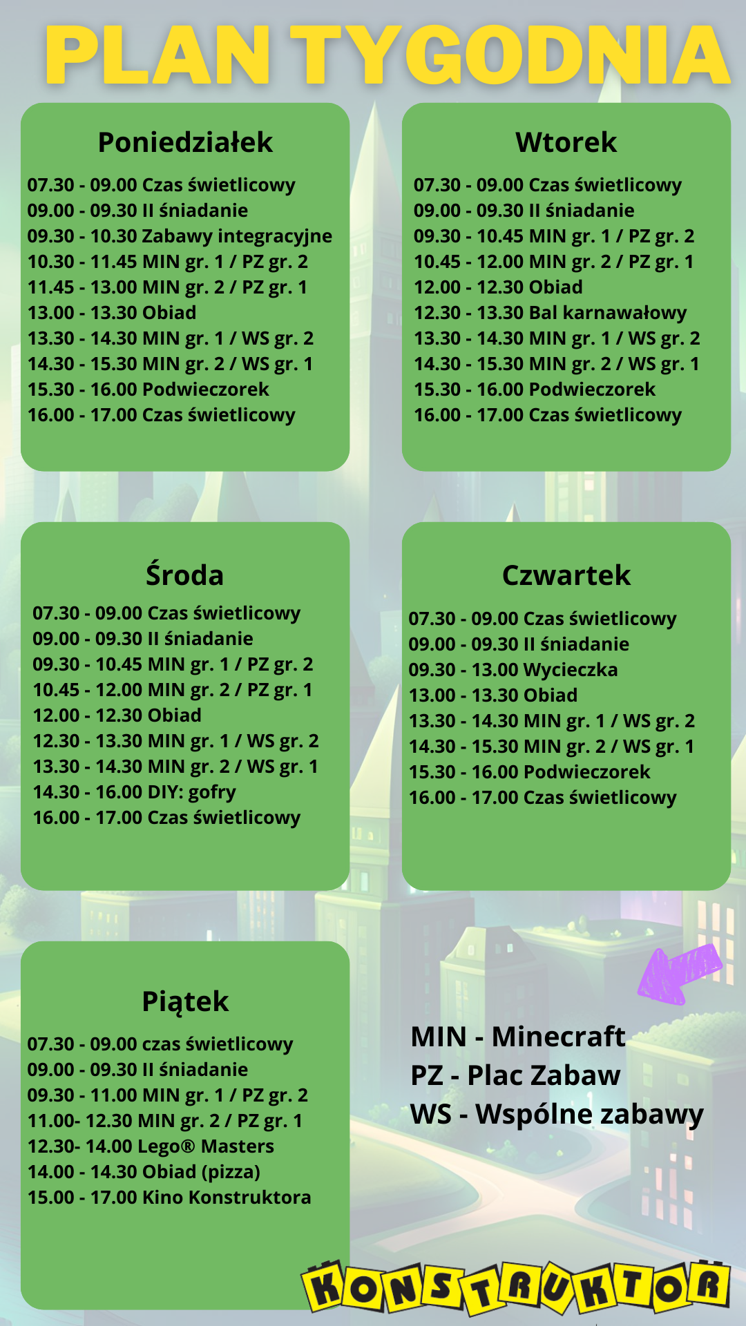 Świetlica – podczas tego czasu będziemy mogli wspólnie się zrelaksować. Będą czekały na nas gry planszowe, klocki Lego® oraz konsola PS4/PS5 – gdzie zapisując się do naszej Konstruktorskiej kolejki – będziemy mieli 10 minut na szaleństwo i wspólne granie.